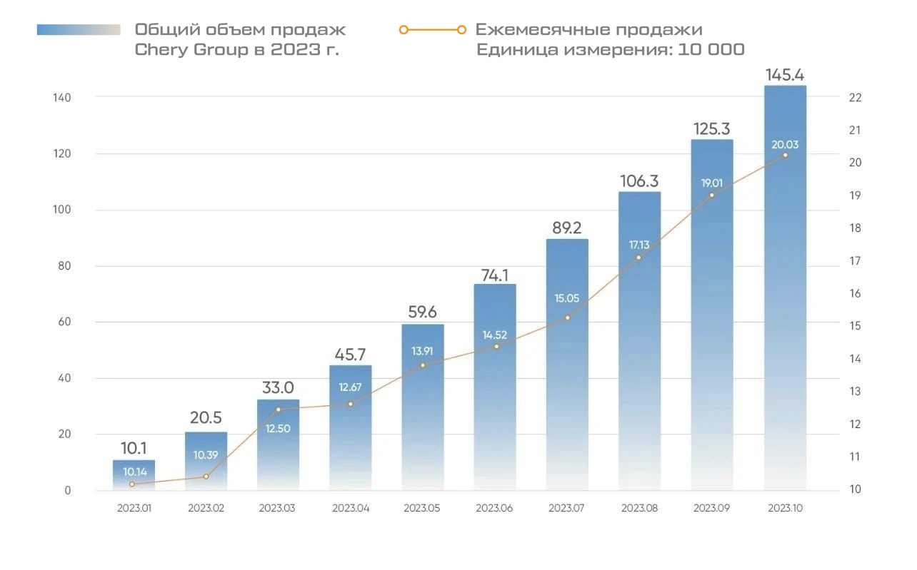 В октябре мировые продажи CHERY GROUP превысили 200 000 автомобилей, что стало абсолютно новым рекордом в истории компании – количество проданных автомобилей за один месяц.